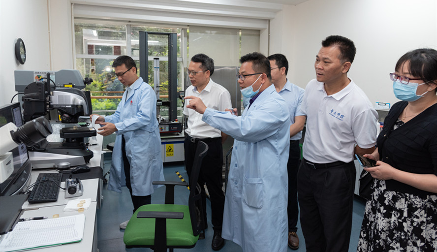 第一阶段,胡文涛带队赴广东风华高新科技股份有限公司(以下简称“风华高科”)考察交流。在风华高科副总裁付振晓的陪同下,随行人员参观了新型电子元器件关键材料与工艺国家重点实验室,深入了解实验室发展历程、取得的荣誉和科技成就,与一线科研工作者进行交谈,了解电子元器件领域的科技动态和创新前沿。胡文涛强调要充分学习借鉴风华高科在高水平科研平台建设方面的经验,以电子信息硕士学位点建设为抓手,强化校企合作,打造产学研深度融合平台与实践基地,加强与风华高科在人才培养、科学研究、基地建设等方面的交流合作,不断提升我校科研创新能力、人才培养质量和校企合作水平。