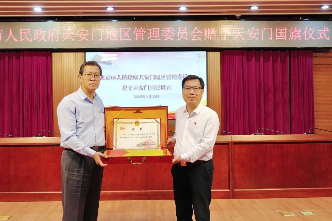 本网讯 9月30日,北京市人民政府天安门地区管理委员会举行赠予天安门国旗仪式。天安门地区管委会党组成员、副主任姚辉(正厅局级)向学校赠送国旗,校党委书记谢冠华代表学校接收国旗并签署《国旗赠予协议》,校党委委员、宣传统战部部长、党政办主任陈前,相关单位负责人参加赠旗仪式。